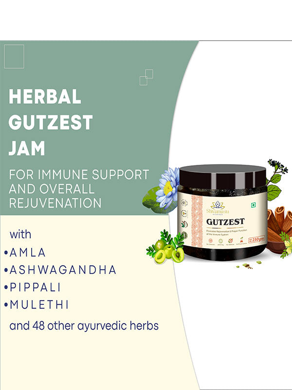 GUTZEST by Shivamastu Ayurveda is a delicious Ayurvedic herbal jam known for its many health benefits. Based on the traditional Ayurvedic formula with amalaki, or amla, as the herbal base, our Chyavanprash honors the ancient wisdom of this formula while ensuring all ingredients are ethically and sustainably sourced. Its blend of 52 authentic ayurvedic herbs Gutzest herbal jam is a great part of a daily routine for kids and adults alike and can be especially supportive during rejuvenation, after a cleanse or detox, or when recovering from illness. As its name suggest it supports you gut health as natural rejuvenate.