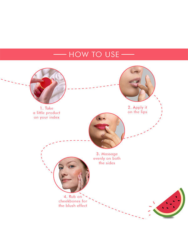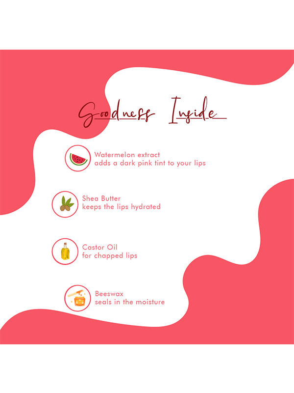 Korus Essential Watermelon lip and cheek is an ideal solution for chapped and undernourished lips. Shea butter acts as a healing agent and keeps the lips hydrated in roughest of weathers while the faint taste of watermelon remains on your lips after application. Made with the perfect blend of Candelilla wax, that locks the moisture in, and Carnauba wax, that provides a glossy surface, with castor oil. It gives a dark pink tint to your lips making them look soft, plumpy and attractive and can also be used on your cheeks for a blush effect.