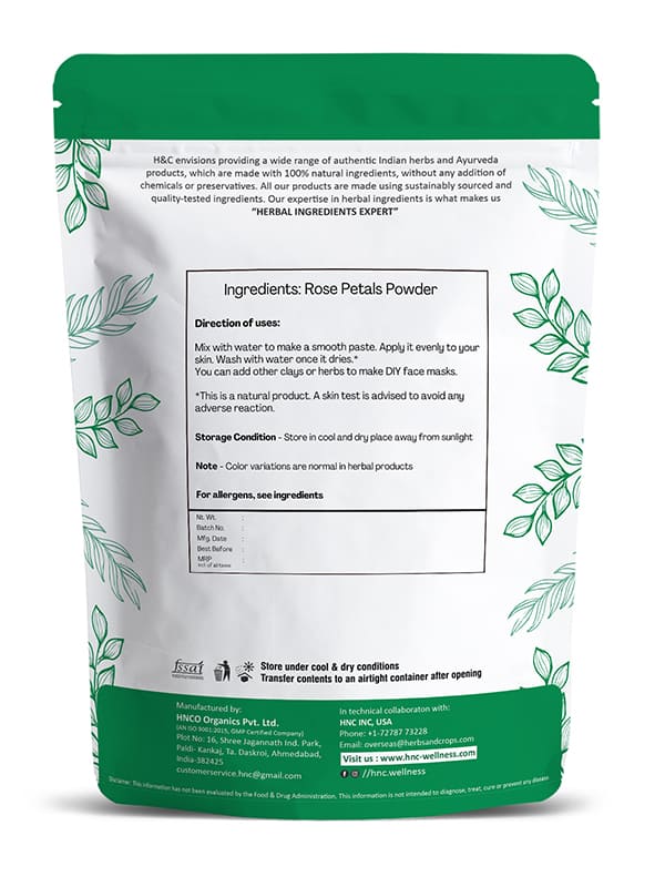 Directions: Take the required amount of Rose Petals Powder in a bowl. Add an equal amount of Multani Mitti / Fuller's Earth Powder (Optional). You can also add other herbs like Neem, Tulsi, Aloe Vera Powder, Etc.