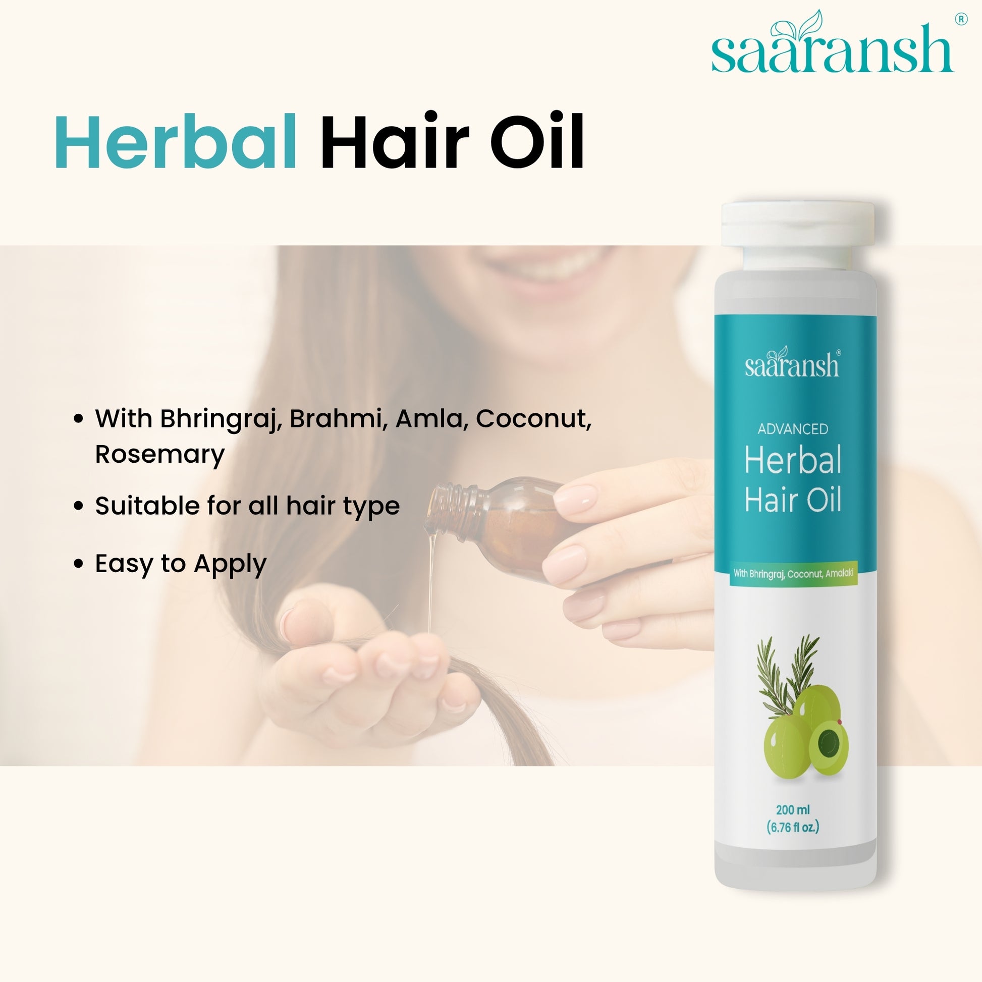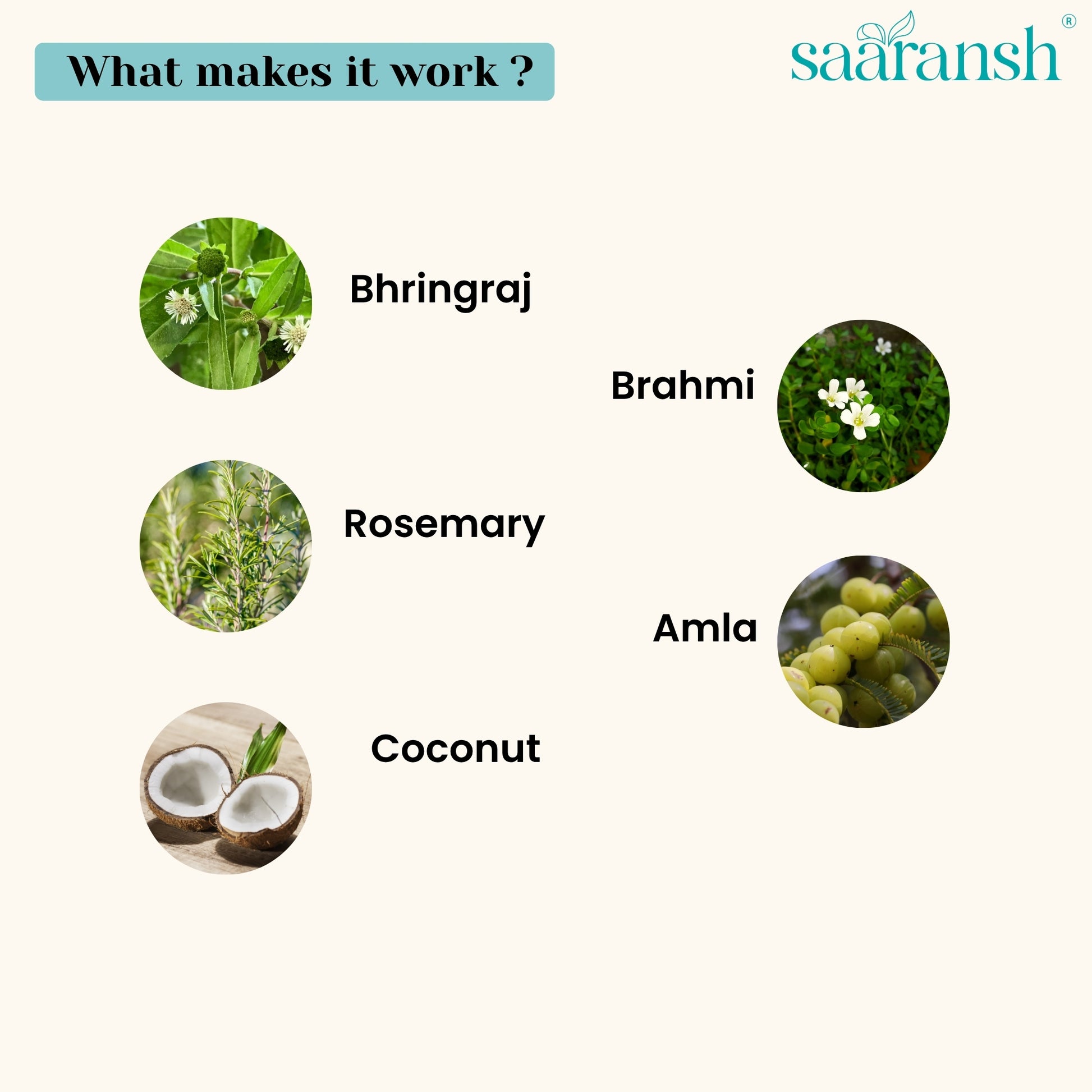 Saaransh Herbal Hair Oil is infused with the benefits of Sesame, Almond, Coconut, Onion, Bhringraj, Amla, Brahmi, and Rosemary Oils.
