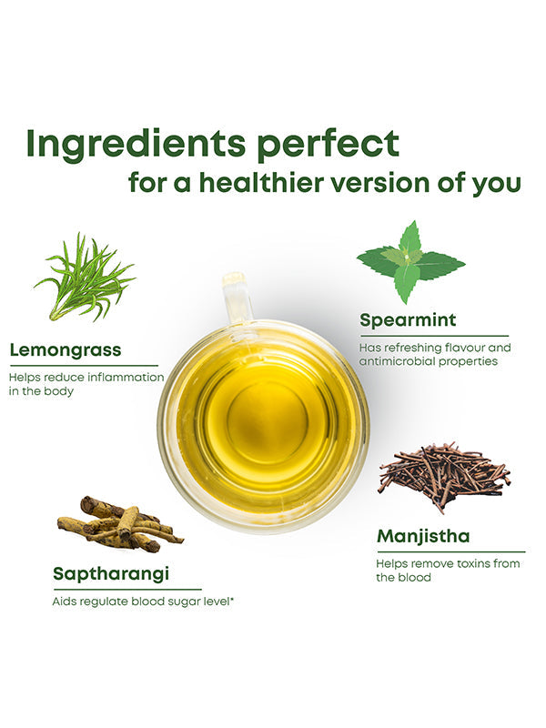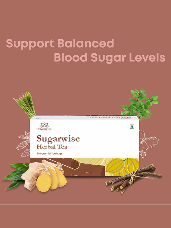 Sugarwise Herbal Tea, a carefully crafted blend of authentic Indian Ayurvedic herbs designed to support metabolic health and balanced sugar levels. This herbal infusion is thoughtfully created to provide a harmonious experience.